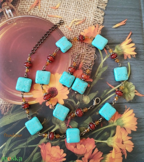 Türkinit és karneol ékszerszett - türkiz színű howlit, narancssárga karneol, borostyán sárga üveggyöngy