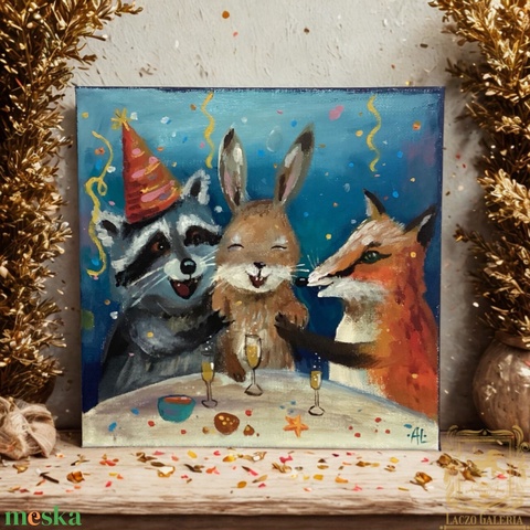 Party - Eredeti Akril Festmény Vásznon - Laczó Ágnes kortárs festő/grafikus művész - Róka, Nyuszi, Mosómedve