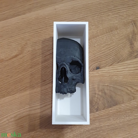 A fehér keret és a fekete koponya erős kontrasztja szoborszerű, galériás hatást kelt, így nemcsak könyvek megtámasztására, hanem önálló dekorációként is kiválóan megállja a helyét.