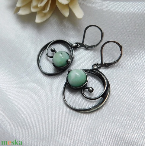A fülbevaló tiffany technikával készült larimár, réz és ólommentes, ezüsttartalmú ón felhasználásával. A díszítés szintén saját készítésű, nem tartalmaz gyári elemeket. A díszítés szintén saját készítésű, nem tartalmaz gyári elemeket.A fémrészt óezüstre patináztam és lelakkoztam, hogy sokáig szép maradjon. Orvosi acél akasztókra tettem.