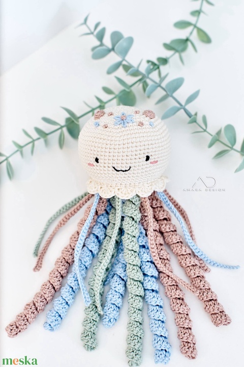 Horgolt NAGY krém polip virághímzéssel - rágókaként és csörgővel is kérhető (feláras)
