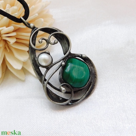 A medál Tiffany technikával készült malachit, folyami gyöngy, réz és ólommentes, ezüsttartalmú ón felhasználásával. A díszítés szintén saját készítésű, nem tartalmaz gyári elemeket. A fémrészt óezüstre patináztam és lelakkoztam, hogy sokáig szép maradjon.