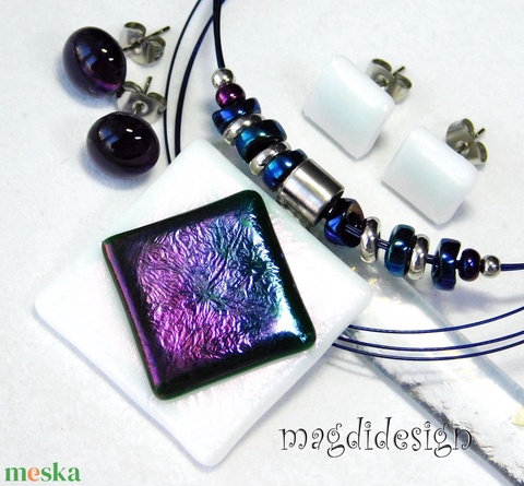 Bíbor-kék fehéren üvegékszer szett nyaklánc 2 pár fülbevaló