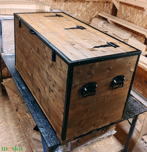Kézműves óriás láda antik dió színben, kovácsoltvas jellegű vasalatokkal
