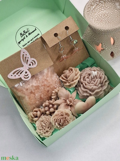 Kókuszos pisztácia illatú kényeztető ajándékbox nőknek , fülbevalóval