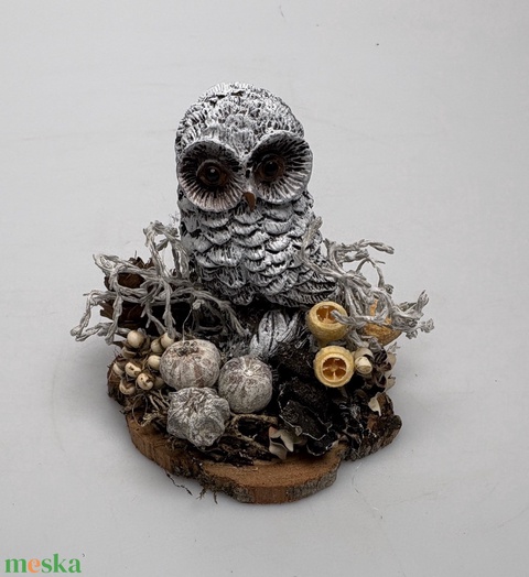 Újévi fogadalom teljesítéséhez segítséget nyújtó, faszeletre telepedett fehér baglyos téli pöttöm asztaldísz