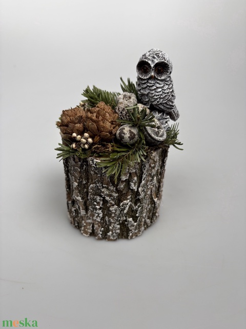 Újévi fogadalom teljesítéséhez segítséget nyújtó, magaslaton pihenő fehér baglyos téli asztaldísz