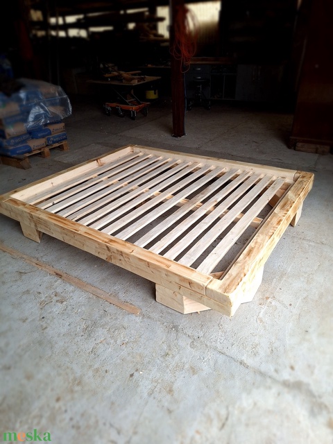 Rusztikus barna fenyőágy, fenyő ágykeret, 160x200 cm fa matractartóval, gerendából