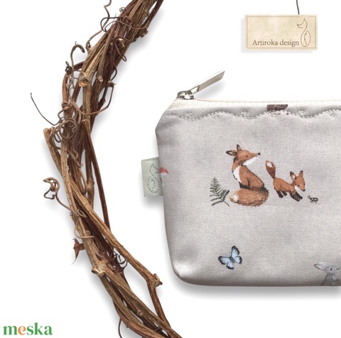 Prémium pamut textilből készült ez az erdei állatok mintás, irattartó pénztárca. Róka mama a kis-rókával, őzike nyuszival, mackó a vörösbeggyel, kisegér, farkas és mókus mintával. A cipzárt egyedi hímzéssel díszítettem. Bélése hozzáillő tappancsos pamut textil. Tárolhatóak még benne a mindennapos használatban lévő sminkek, kozmetikai szerek, ékszerek vagy egyéb apróságok. Kártyáid, irataid tárolására is alkalmas.
