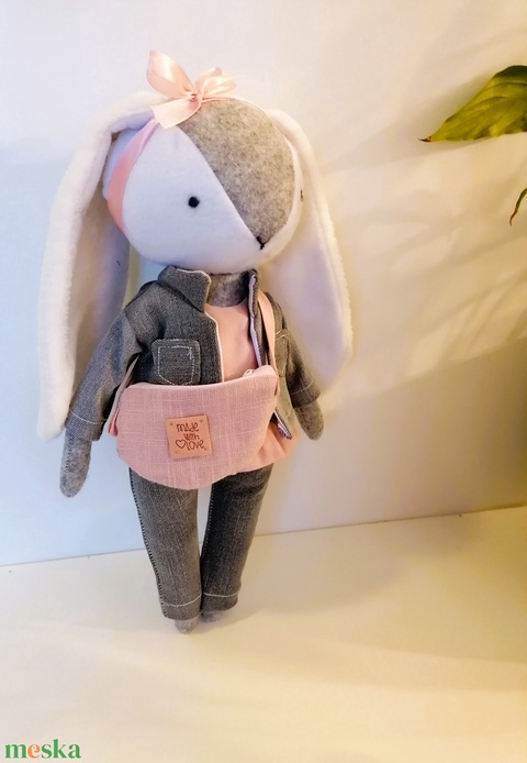 Nyuszi lány, fodros felsőben, farmer kabátban és nadrágban - kézműves gyerekjáték, öltöztethető játékfigura