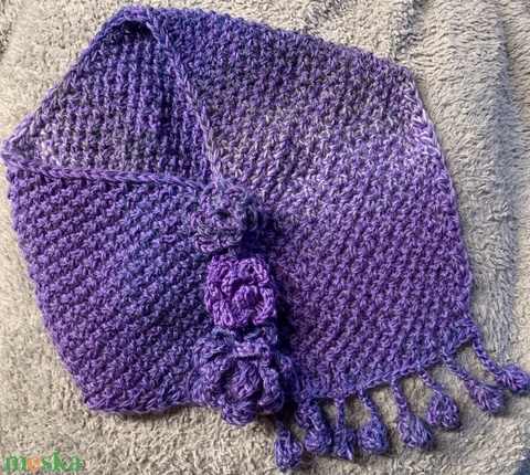 Sál kézi készítésű lila melírozott gyapjú fonalból kötöttem és horgolt virágokkal tettem egyedivé