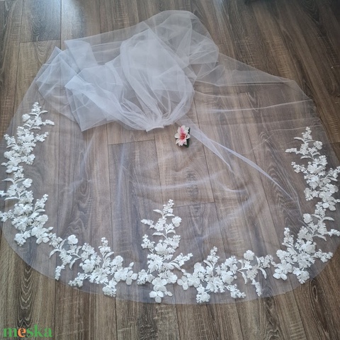 FTY141 - 1 rétegű, hímzett virágos, csipkés szélű FEHÉR, 3 méteres menyasszonyi fátyol