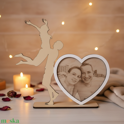 A szív alakú kép mellett egy romantikus, táncoló pár sziluettje teszi teljessé a kompozíciót, szimbolizálva a közös boldogságot és a szerelmet. Tökéletes dísze lehet a polcnak, az éjjeliszekrénynek vagy az íróasztalnak, ami minden nap emlékeztet titeket a legszebb pillanatokra.