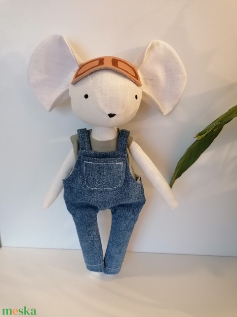 Pilóta egér fiú, kertésznadrágban, pólóban - kézműves textil játékfigura, öltöztethető