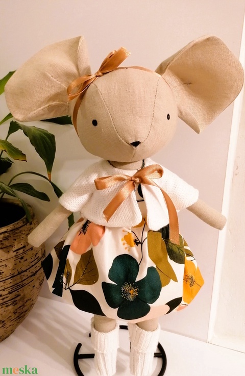 Bájos egérlány, pelerinben, virág mintás ruhában, csizmában - kézműves textil játékfigura, öltöztethető