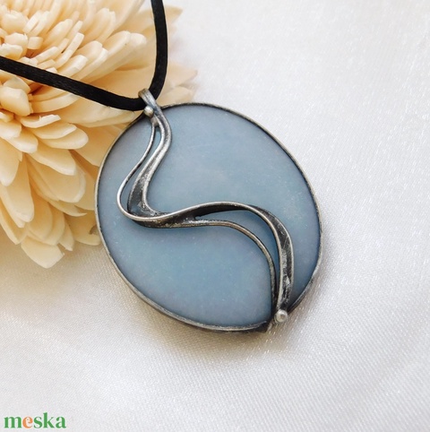A medál Tiffany technikával készült angelit, réz és ólommentes, ezüsttartalmú ón felhasználásával. A díszítés szintén saját készítésű, nem tartalmaz gyári elemeket. A fémrészt óezüstre patináztam és lelakkoztam, hogy sokáig szép maradjon.