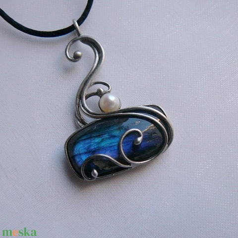 A medál Tiffany technikával készült labradorit és ólommentes, ezüsttartalmú ón felhasználásával. A díszítés szintén saját készítésű, nem tartalmaz gyári elemeket. A fémrészt óezüstre patináztam, lekezeltem antioxidánsal és lelakkoztam, hogy sokáig szép maradjon.