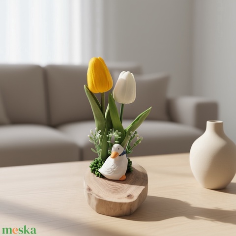 Prémium tavaszi asztaldísz tulipánokkal és kislibával