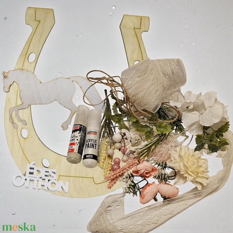 - 1 db patkó formájú fa alap (kb. 24 cm) + fa ló motívum és felirat