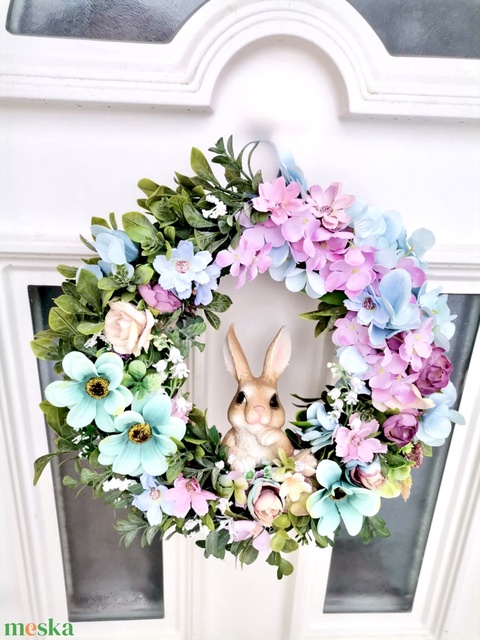 Hortenzia ajtódísz, kopogtató, tavasz, tél, nyuszi ajtódísz