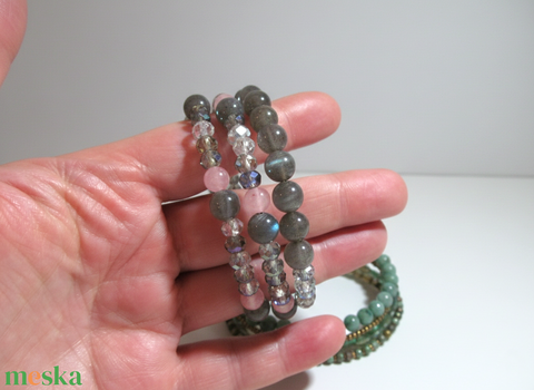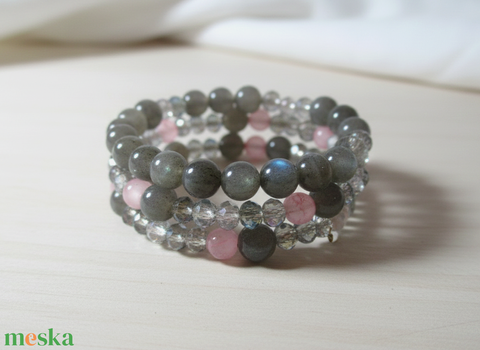 Misztikus Labradorit varázs – Rózsaszín acháttal és kristályokkal díszített háromsoros karkötő
