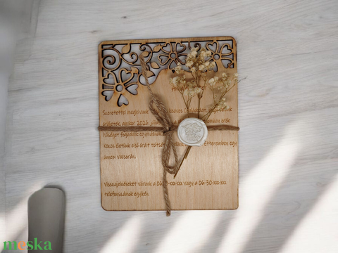 Egyedi, gravírozott fa esküvői meghívó! Rusztikus kiegészítőkkel és virágmintával !