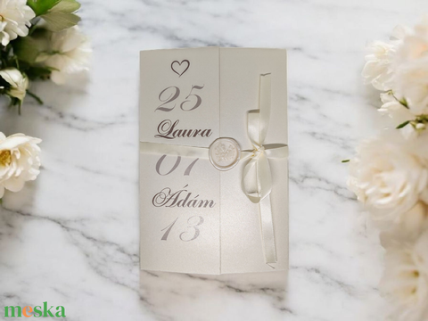 • Kifinomult Részletek: A meghívót szatén szalag és egy elegáns pecsét (viaszlenyomat) díszíti, amely hozzáadja a luxus érzetét anélkül, hogy túlzsúfolttá tenné a megjelenést.