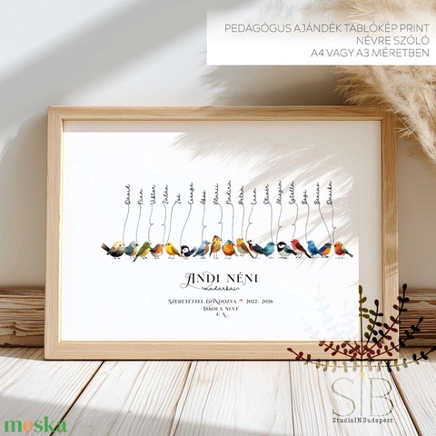 Névre szóló pedagógus ajándék, csoportajándék tabló iskolai óvodai ballagásra, madár illusztrációval