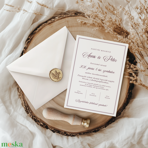 A Classy kollekciót a letisztult, klasszikus stílusa teszi igazán különlegessé, ami tökéletesen passzol egy romantikus, elegáns esküvőkhöz. A bordó keret és betűk exkluzív hatást keltenek, amint kézbe veszted a meghívót.