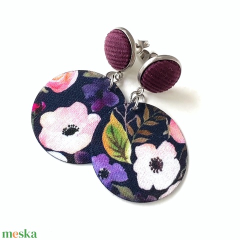 Sötétkék alapon virágmintás kisméretű textilfülbevaló nemesacél alkatrészekkel