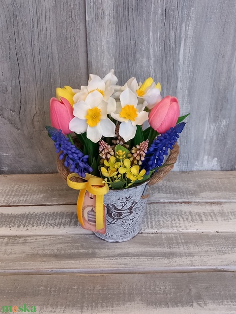 - Anyag/Összetevő szalag, művirágok, kaspó, dekorkártya, tűzőhab, műzöldek