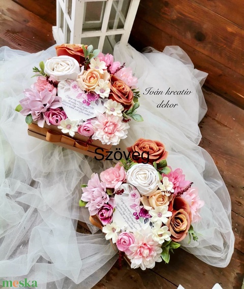 Szülőköszöntő ajándék szett, Szülőköszöntő virágbox, esküvő, Selyemvirág köszöntő