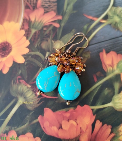 Türkinit csepp fülbevaló - türkiz színű howlit és borostyán sárga üveggyöngy