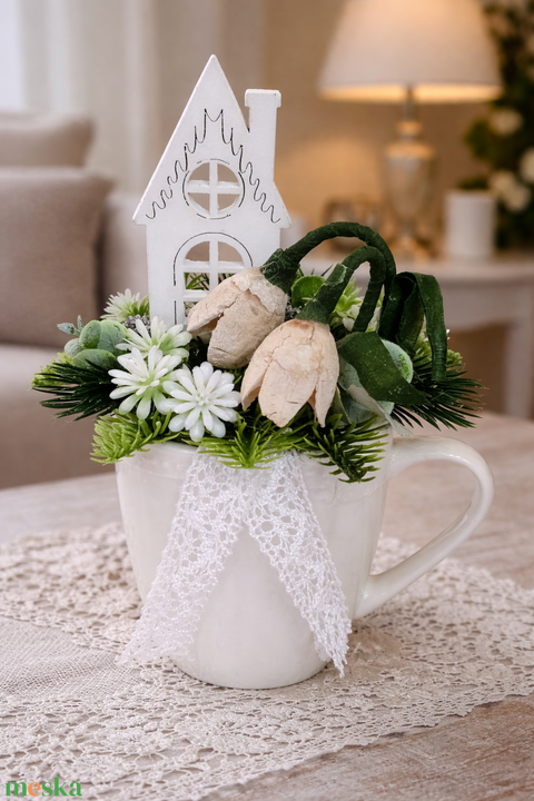 Téli bögrés dísz saját készítésű hóvirágokkal