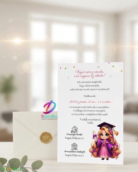 Kedves kis csajos figurával díszített ballagási meghívó, ovisoknak ❤️ MINIMUM MEGRENDELÉS-8DB A gyártás zökkenőmentes lebonyolítása és a magas minőség biztosítása érdekében a rendelés minimális darabszáma 8 darab. A ballagás az élet egyik legfontosabb állomása, amely megérdemli a méltó felvezetést. ​❤️SZEMÉLYRE SZABVA A szövegezést teljesen a Te igényeidre szabjuk (név, dátum, helyszín, szöveg). Ha névsort is szeretnél, 2 oldalas verzióban készítjük. Ha idézetet is kérsz, akkor válaszd a kinyitható meghívót. ❤️ PAPÍRVÁLASZTÉK * A meghívó háromféle, gondosan válogatott 250g-os, merevebb papíron készül, hogy a stílusotokhoz és költségvetésetekhez igazodjon: - Sima fehér karton – letisztult, merev, kiváló ár-érték arányú alapváltozat - Textúrált kreatív karton – enyhén rusztikus, természetes felületű papír, különleges tapintással - Gyöngyházfényű karton – elegáns, enyhén csillogó, exkluzív megjelenés *** A papírtípust a rendelésnél a legördülő menüből tudod kiválasztani. Minden opció kiváló minőségű, kézbe véve is igényes megjelenést biztosít. ❤️ VIASZPECSÉT * Színek a legördülő menüből választhatók. * Ha szeretnél viaszpecsétet, a rendeléskor válaszd ki. ❤️ FIZETÉS Utánvételre és bankkártyás fizetésre nincs lehetőség egyik szállítási módnál sem. A megrendelés ellenértékét átutalással, vagy személyesen, az Erste Bank fiókjaiban történő pénztári befizetéssel tudod kiegyenlíteni, a számla alapján. ❤️ MÉRET * 105 × 148 mm (A6), 1 oldalas kivitel * Kézbe simuló, figyelemfelkeltő forma *** További kivitelezési opciókat a legördülű lehetőségek közt találsz ha elérhető az adott terméknél. ❤️ DESIGN A meghívó letisztult, ízléses megjelenését a részletek gondos kidolgozása és az egységes arculat garantálja. Az egyedi grafikai elemek és harmonikus tipográfia támogatják, hogy a meghívó tökéletesen illeszkedjen az esemény stílusához és az egyéni elképzelésekhez. ❤️ NYOMTATOTT OLDALAK Teljesen személyre szabható szövegezés: dátum, helyszín, idézet, program. A meghívó nyomtatott oldalai teljes mértékben testreszabhatók – a szövegezés, elrendezés és tartalom igény szerint alakítható, hogy tökéletesen illeszkedjen a Te eseményed hangulatához és stílusához. ❤️ EXTRA LEHETŐSÉGEK Kiegészítő termékek széles választéka áll rendelkezésre, mint például borítékok, szalagok, viaszpecsétek amelyek egységes megjelenést biztosítanak az eseményhez, és tovább emelik a meghívó egyediségét. ❤️ FONTOS * A képeken látható borítékok, viaszpecsétek és kiegészítők dekorációs célt szolgálnak, nem az alapajánlat részei és nem pont ilyen színűek. * A monitoron megjelenő színek eltérhetnek a valós terméktől * Az ár 1 db meghívóra vonatkozik, boríték és kiegészítők nélkül. ❤️ RENDELÉS MENETE ÉS ELKÉSZÍTÉS LÉPÉSEI !!!VÁSÁRLÁSKOR FOKOZOZTAN FIGYELJ, HOGY AZ E-MAIL CÍMED HELYESEN LEGYEN MEGADVA!!! * Tedd a kosárba a kívánt darabszámban a meghívót és választott kiegészítőt * E-mailben küldd el a szöveget (dátum, nevek, helyszín stb.) * Látványtervet küldök e-mailben, jóváhagyás és fizetés után indítom a gyártást * Két alkalommal díjmentesen módosítható a látványterv (szöveg, elrendezés) * A gyártás a számla szerinti összeg beérkezése után kezdődik, átfutási idő kb. 5-7 munkanap ❤️ A Meskás visszaigazolásban találod az elérhetőségem, kérlek, oda küldd a megrendeléssel kapcsolatos üzenetedet. Ellenőrizd a spam mappát is, ha nem kapsz választ 1-2 napon belül!