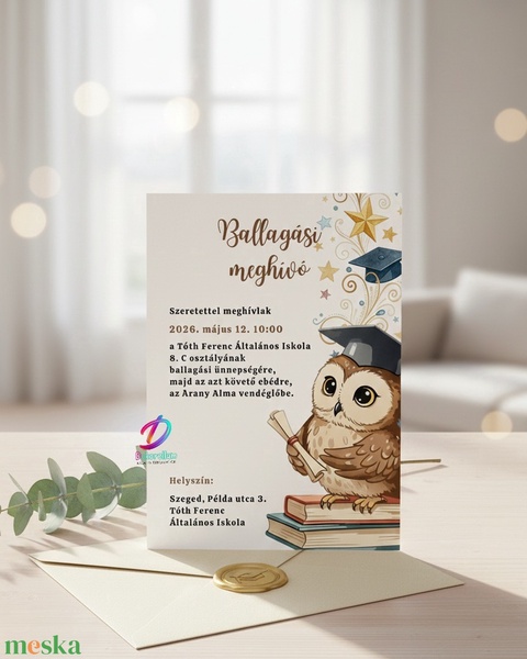 Kedves és bölcs bagoly figurával díszített ballagási meghívó, ovisoknak