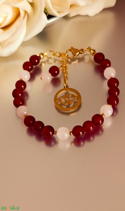 Karneol és rózsakvarc ásványkarkötő szív medállal