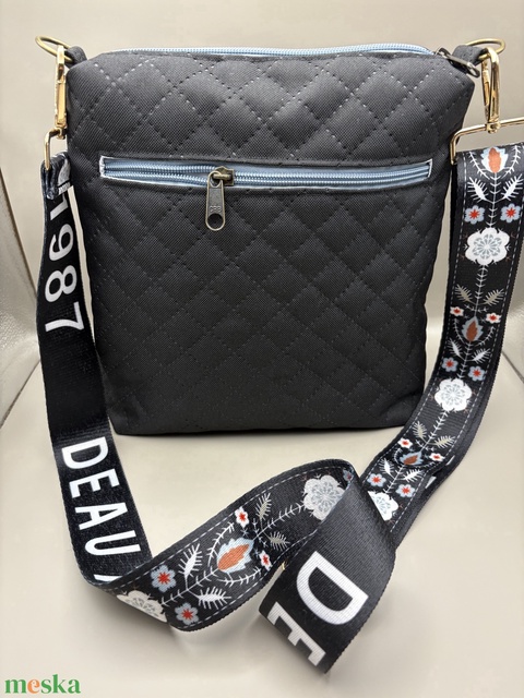 - Anyaga: vízálló steppelt polieszter, pamutvászon bélés, zippzár, virágos pánt karabinerrel