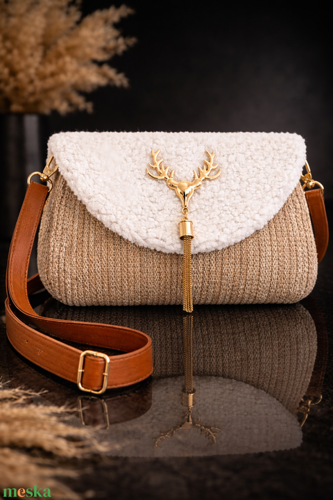 Különleges női táska, Stílusos keresztpántos táska aranyszínű szarvas díszítéssel, teddy fedéllel