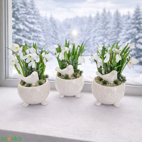 Madárkás dekoráció hóvirágokkal