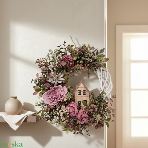 Virágos ajtódísz házikóval – romantikus, természetes stílus