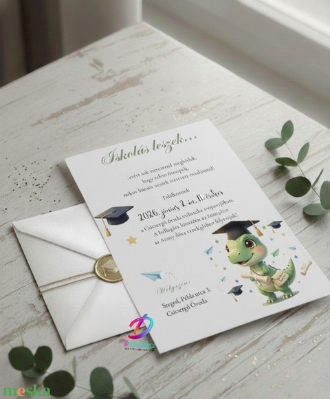 Kedves ballagó dínó figurával díszített ballagási meghívó, ovisoknak