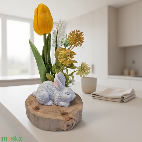 Tavaszi polcdísz alvó nyuszival – letisztult, természetes dekoráció fa alapon