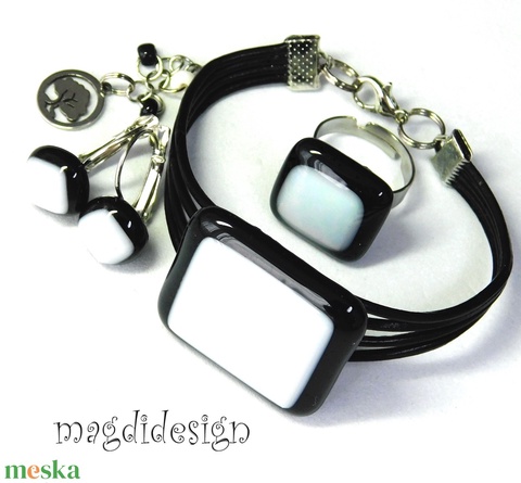 Fekete fehér kocka üvegékszer szett, karkötő, gyűrű, kapcsos fülbevaló