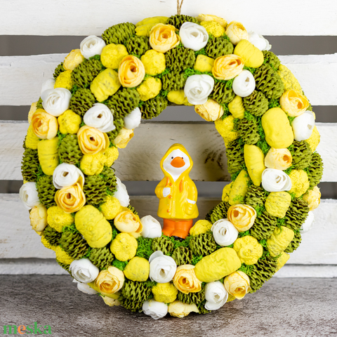 - Anyaga: szalma alap, kiskacsás kerámia figura, művirág, termések