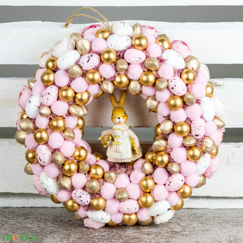 - Anyaga: szalma alap, kerámia nyuszi figura, dekorelemek, termések, hungarocell tojások, művirág