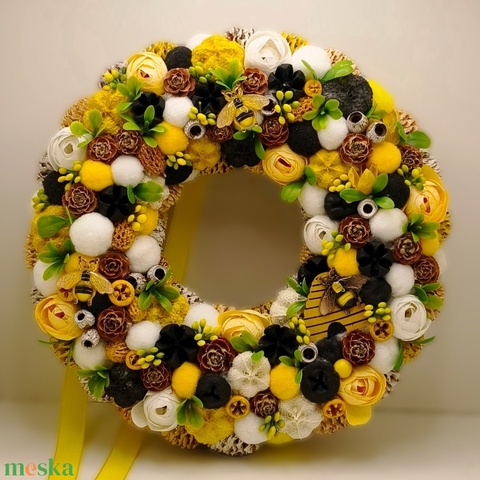 Tavaszi virágos méhecskés koszorú, kopogtató ~24 cm