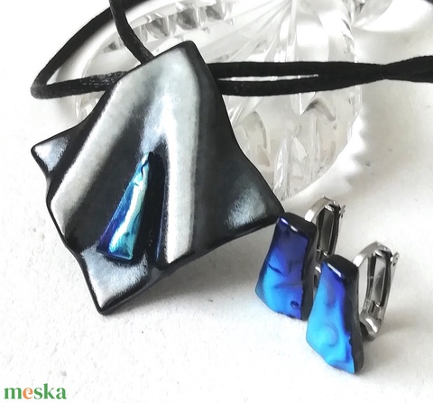 NEMESACÉL! Kék-metál fények nyaklánc és klipszes fülbevaló, ajándék névnapra születésnapra.