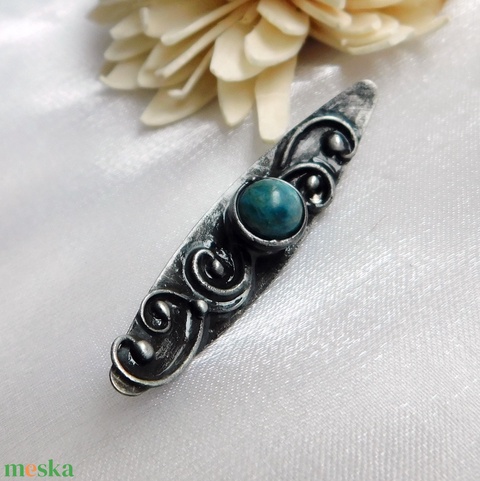 A bross Tiffany technikával készült apatit, réz és ólommentes, ezüsttartalmú ón felhasználásával. A díszítés szintén saját készítésű, nem tartalmaz gyári elemeket. A fémrészt óezüstre patináztam és lelakkoztam, hogy sokáig szép maradjon.