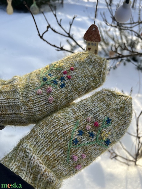 Kézzel kötött gyapjú kesztyű hímzett virágokkal – "Tavaszi ébredés" (S-es méret)